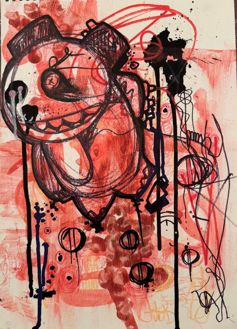 Created from a dark and heavy place, this piece carries raw emotion in every line and stroke. The chaos, the scribbles, the red tones—everything is intentional. It’s bold, messy, and honest… yet somehow still beautiful. A reminder that even in our darkest moments, something powerful can be born.
